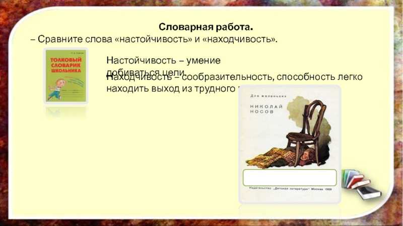 Слайд 7 Словарная работа. – Сравните слова «настойчивость» и «находчивость». Настойчивость