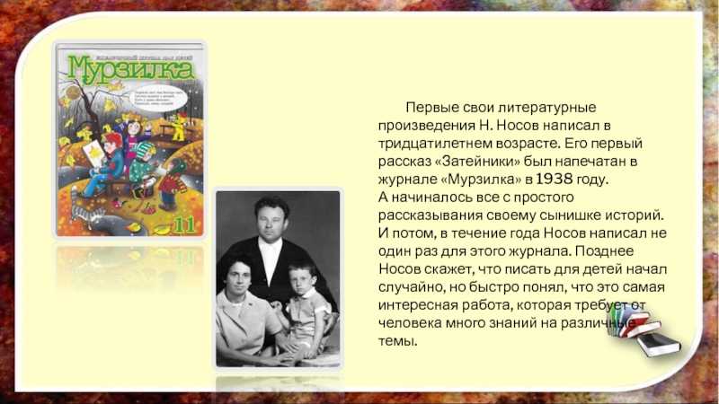 1938 году. А начиналось все с простого рассказывания своему сынишке историй. И потом, в течение года Носов написал не один раз для этого журнала. Позднее Носов скажет, что писать для детей начал случайно, но быстро понял, что это самая интересная работа, которая требует от человека много знаний на различные темы.