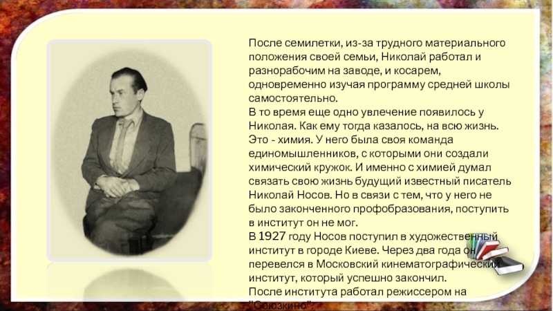 школы самостоятельно.В то время еще одно увлечение появилось у Николая. Как ему тогда казалось, на всю жизнь. Это — химия. У него была своя команда единомышленников, с которыми они создали химический кружок. И именно с химией думал связать свою жизнь будущий известный писатель Николай Носов. Но в связи с тем, что у него не было законченного профобразования, поступить в институт он не мог. В 1927 году Носов поступил в художественный институт в городе Киеве. Через два года он перевелся в Московский кинематографический институт, который успешно закончил.После института работал режиссером на «Союзкино».