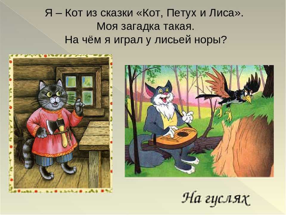 Сказка «Кот, петух и лиса» полна слов, которые надо пояснить детям. Например, кот «бросился в погоню», это означает, что он очень быстро побежал. Или «отбил петуха» у лисы – вырвал из ее цепких лап. «Дремучие боры» – очень густые и темные леса. «Гусли» – древнейший инструмент со струнами. «Коробок» – плетеная корзина, часто с крышкой, которую носят на ремне за спиной.