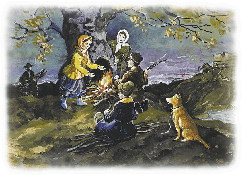 — Постойте! — кричит один мальчуган. — Тащите-ка сучья к берёзе. Вон у самых корней будто печурка, там уж костёр не задует.