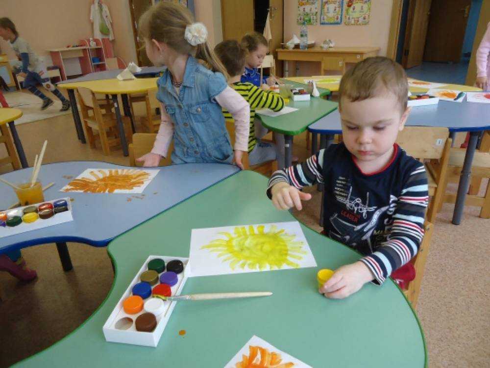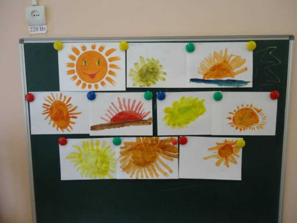 Воспитатель напоминает детям, что солнце имеет круглую форму, выслушивает варианты детей о том, какого цвета может быть солнце (желтое, оранжевое, красное) и как можно нарисовать солнечные лучи.