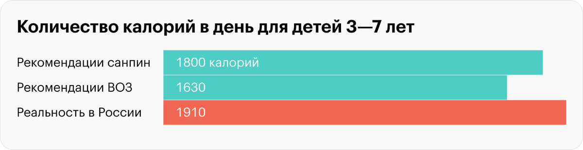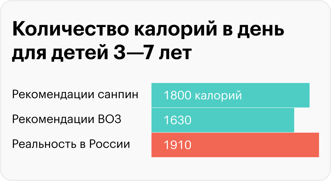 Стоит учесть, что в западных рекомендациях указаны нормы калорий за весь день. Но дети едят не только в саду, поэтому российские 1800 ккал только за время в садике могут быть для дошкольника перебором. Возможно, такая высокая калорийность блюд в санпине обусловлена тем, что не все дети охотно едят в садике: многие оставляют на тарелке половину порции и даже больше. Тем не менее у каждого третьего российского ребенка до 13 лет есть лишний вес — и этот показатель растет с каждым годом.