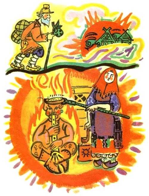 Солнышко сказало жене, чтоб настряпала оладьев. Вот жена настряпала. Солнышко уселось среди полу, жена поставила на него сковороду — и оладьи сжарились. Накормили старика.