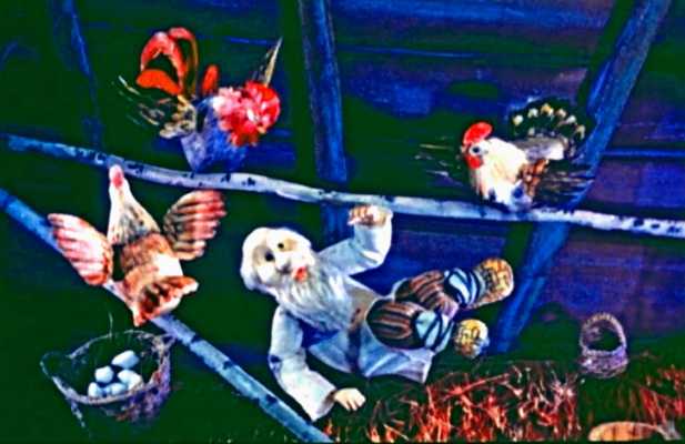 Ночью старик шатнулся, да оба как грохнутся с насеста! Все бока себе переломали, еле живы остались.