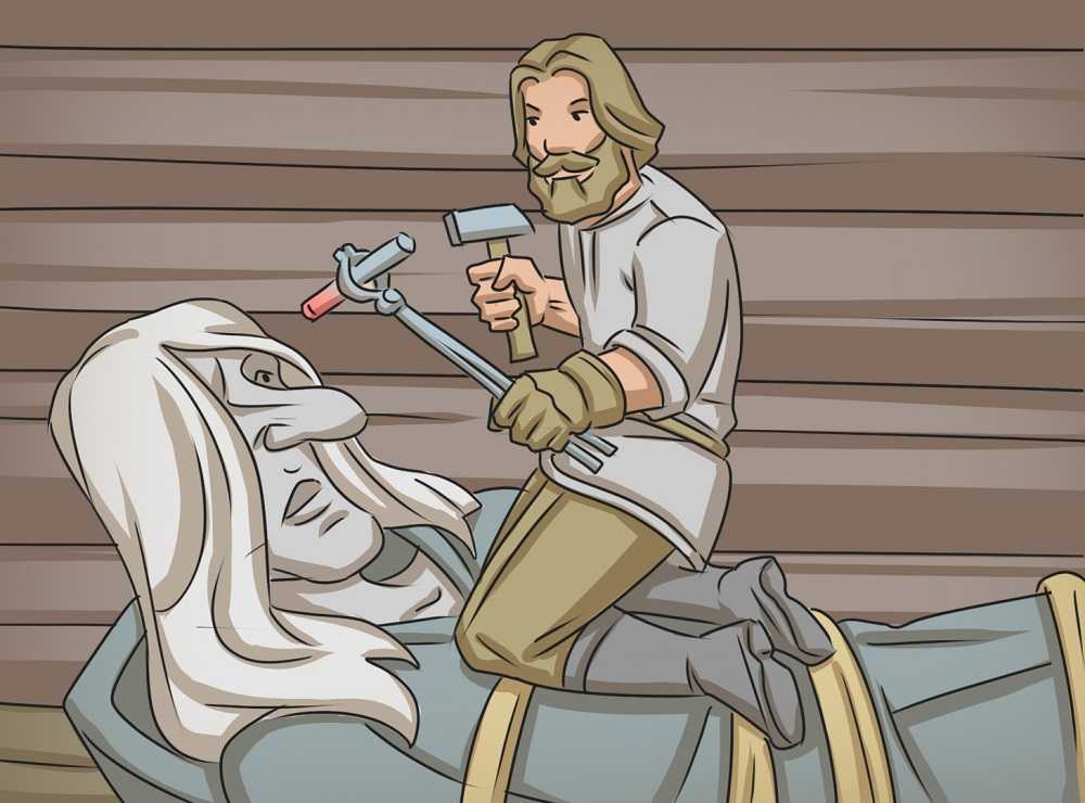 . Взял он толстую верёвку да этою верёвкою скрутил её хорошенько. Вот он взял шило, разжег его, наставил на глаз-то ей на здоровый, взял топор да обухом как вдарит по шилу. Она как повернётся — и разорвала верёвку, да и села на пороге. » («Лихо одноглазое». Русская сказка в обработке А.Н. Афанасьева).