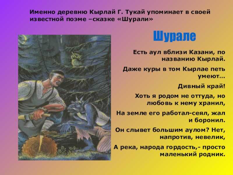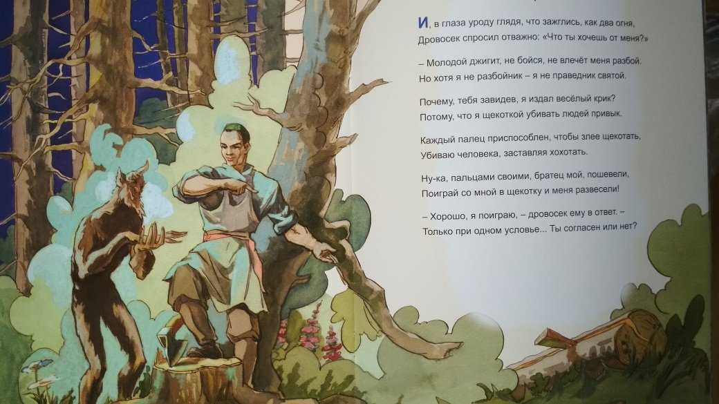Читать краткое содержание, краткий пересказ сказки «Шурале» Недалеко от Казани есть чудесный аул, возле которого течет красивая речка. Вокруг аула росли леса, в которых было полно ягод и грибов, и под сенью лесных великанов всегда слышался птичий перезвон. Лес этот кажется людям удивительным. В нем много разных зверей — медведей, волков, лисиц, зайцев. Но есть в лесу и тайные тропинки по которым бродят ужасные звери и чудовища, джинны, пери, шурале. Много чудес в этом лесу. Как-то в лунную ночь в этот лес поехал за дровами молодой джигит. Он стал рубить дрова и вдруг услышал страшный вскрик. Джигит оборачивается и видит перед собой скрюченного карлика, необычайно страшного и уродливого. На лбу карлика небольшой рог, нос согнут крючком, на тонких руках десять длинных пальцев. Джигит не испугался и спросил уродца, чего тот от него хочет. Карлик ответил, что он не разбойник, но любит щекотать людей, и таким образом убивает их. И предлагает сыграть дровосеку в одну игру. Кто кого перещекочет. Джигит соглашается, но ставит свое условие. Пусть шурале поможет ему погрузить толстое бревно на арбу, для чего нужно ухватить бревно за щель на конце. Шурале соглашается, берется за бревно и кладет пальцы в щель. Джигит мигом выбивает клин, которым разбивал бревно и пальцы шурале оказываются в ловушке. Шурале понимает обман и начинает громко кричать, умолять джигита отпустить его, обещает никогда не обижать его. Но джигит уже не слушает шурале, он садится на арбу и собирается ехать в аул. Шурале спрашивает его имя, и джигит рассмеявшись отвечает, что его зовут Вгодуминувшем. Уехал джигит, а шурале стал орать еще громче. На его крики сбежались другие шурале и лесные духи, и стали упрекать пойманного собрата — если прищемило тебя в году минувшем. зачем в этом году орать?