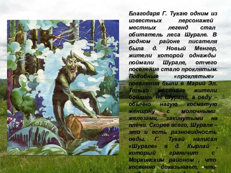Все эти истории можно было списать на богатую татарскую мифологию и суеверное сознание народа, однако у наших соседей, народа мари, мы встречаем удивительные истории про некое лесное существо, которые очень похожи на «татарского» Шурале. Марийцы называют его (её) – Овда, или народ овды. Во многих селах и деревнях Марий Эл до сих пор бытуют настоящие истории про овду, про места, где они обитали, про их проделки и проклятия. И вот что интересно: некоторые свидетели указывают, что овды обитали тут сравнительно недавно, может быть, сто или двести лет назад.