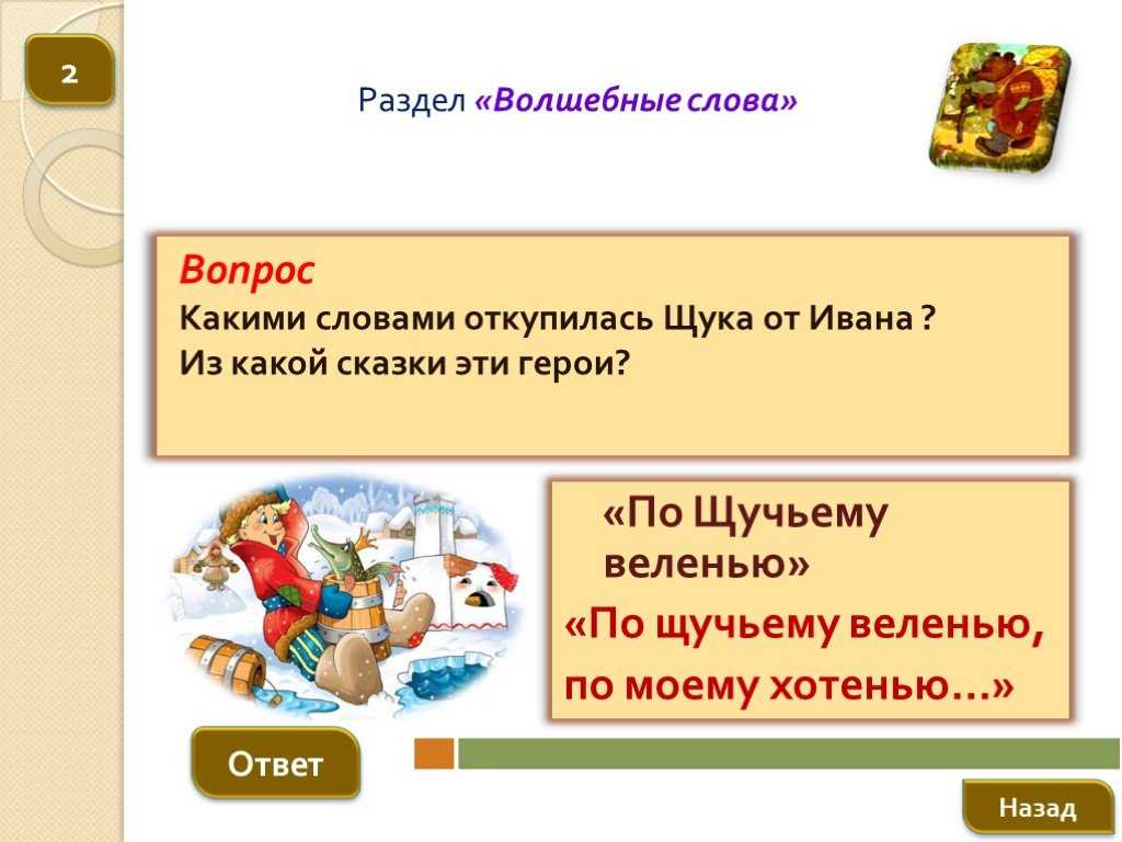 — Сегодня мы с вами проведём сказочную викторину “В гостях у сказки”.