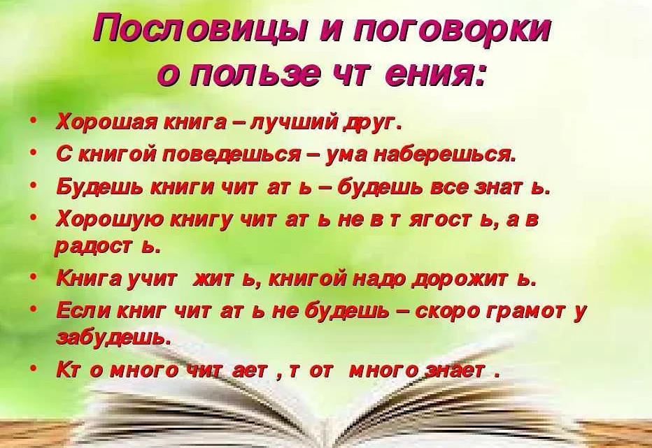 В статье описаны 5 пословиц о книге: «Книга — лучший подарок», «Книга — окно в мир», «Хочешь быть здоровым — читай книги», «Книга — это как друг, который не покидает тебя никогда», «Книги не опишешь, их нужно читать».