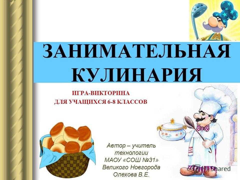Презентация на тему: » ЗАНИМАТЕЛЬНАЯ КУЛИНАРИЯ ИГРА-ВИКТОРИНА ДЛЯ УЧАЩИХСЯ 6-8 КЛАССОВ Автор – учитель технологии МАОУ «СОШ 31» Великого Новгорода Олехова В.Е.» — Транскрипт: