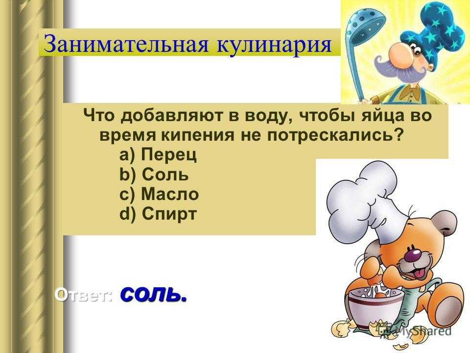 Занимательная кулинария Что добавляют в воду, чтобы яйца во время кипения не потрескались? a) Перец b) Соль c) Масло d) Спирт