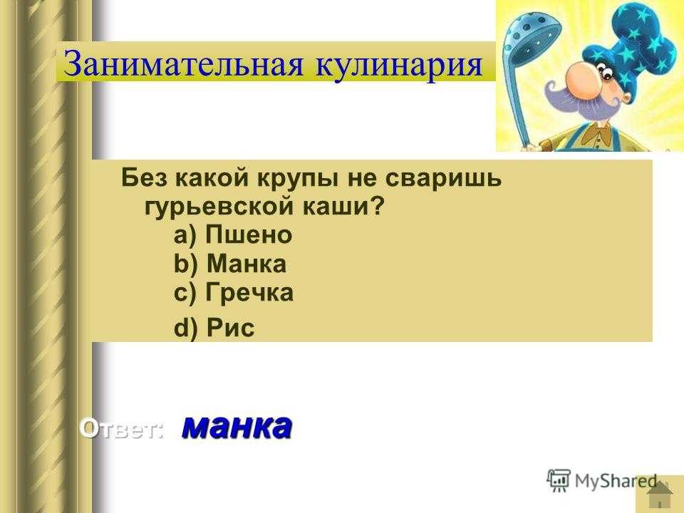 Занимательная кулинария Без какой крупы не сваришь гурьевской каши? a) Пшено b) Манка c) Гречка d) Рис