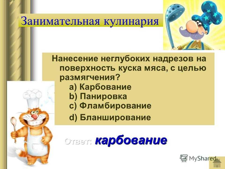 Занимательная кулинария Нанесение неглубоких надрезов на поверхность куска мяса, с целью размягчения? a) Карбование b) Панировка c) Фламбирование d) Бланширование