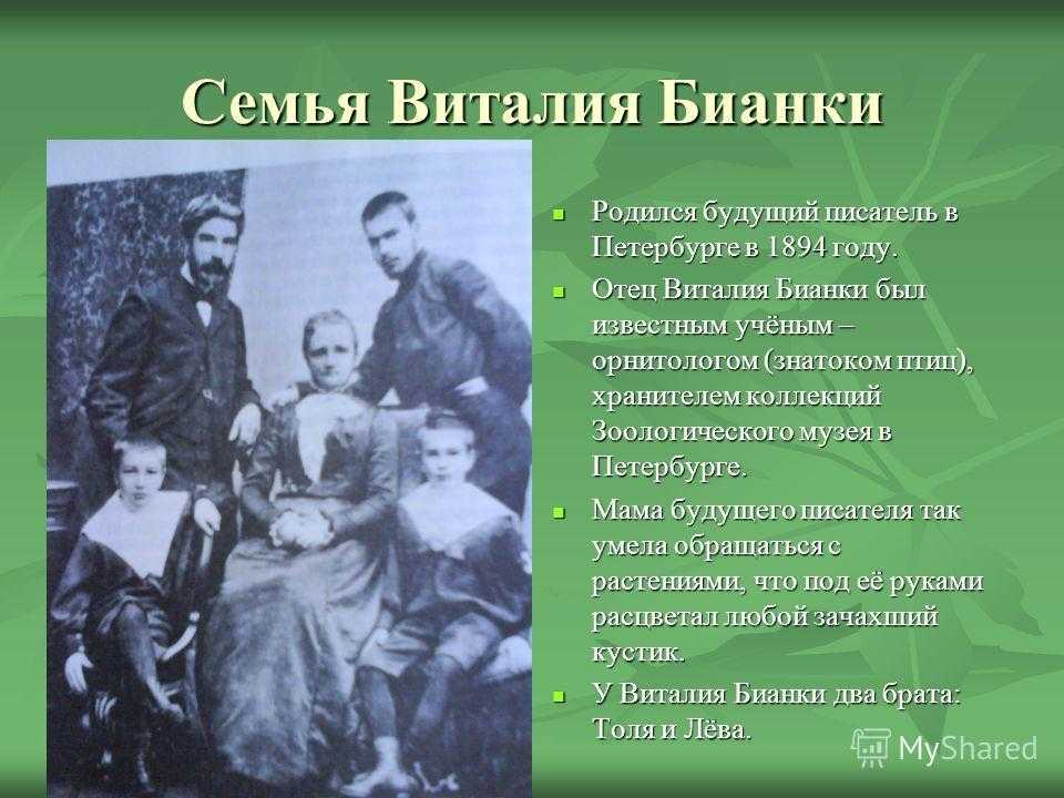 Семья Виталия Бианки Родился будущий писатель в Петербурге в 1894 году. Родился будущий писатель в Петербурге в 1894 году. Отец Виталия Бианки был известным учёным – орнитологом (знатоком птиц), хранителем коллекций Зоологического музея в Петербурге. Отец Виталия Бианки был известным учёным – орнитологом (знатоком птиц), хранителем коллекций Зоологического музея в Петербурге. Мама будущего писателя так умела обращаться с растениями, что под её руками расцветал любой зачахший кустик. Мама будущего писателя так умела обращаться с растениями, что под её руками расцветал любой зачахший кустик. У Виталия Бианки два брата: Толя и Лёва. У Виталия Бианки два брата: Толя и Лёва.