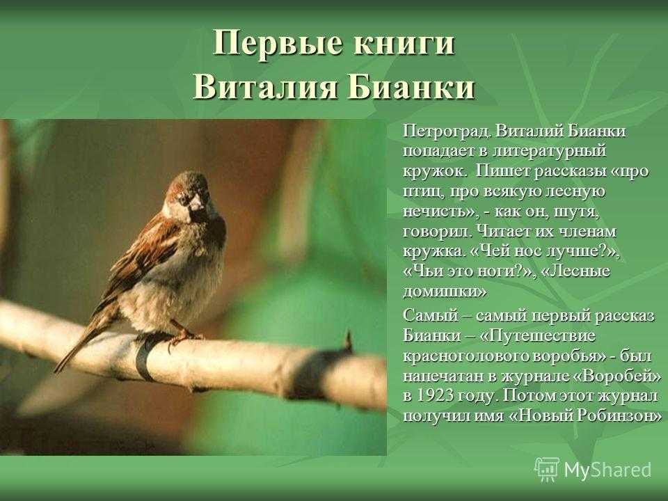 Первые книги Виталия Бианки Петроград. Виталий Бианки попадает в литературный кружок. Пишет рассказы «про птиц, про всякую лесную нечисть», — как он, шутя, говорил. Читает их членам кружка. «Чей нос лучше?», «Чьи это ноги?», «Лесные домишки» Петроград. Виталий Бианки попадает в литературный кружок. Пишет рассказы «про птиц, про всякую лесную нечисть», — как он, шутя, говорил. Читает их членам кружка. «Чей нос лучше?», «Чьи это ноги?», «Лесные домишки» Самый – самый первый рассказ Бианки – «Путешествие красноголового воробья» — был напечатан в журнале «Воробей» в 1923 году. Потом этот журнал получил имя «Новый Робинзон» Самый – самый первый рассказ Бианки – «Путешествие красноголового воробья» — был напечатан в журнале «Воробей» в 1923 году. Потом этот журнал получил имя «Новый Робинзон»