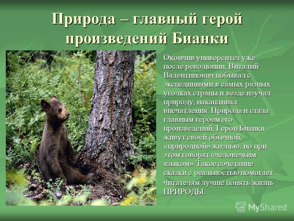 Природа – главный герой произведений Бианки Окончив университет уже после революции, Виталий Валентинович побывал с экспедициями в самых разных уголках страны и везде изучал природу, накапливал впечатления. Природа и стала главным героем его произведений, Герои Бианки живут своей обычной, «природной» жизнью, но при этом говорят «человечьим языком».Такое сочетание сказки с реальностью помогает читателям лучше понять жизнь ПРИРОДЫ. Окончив университет уже после революции, Виталий Валентинович побывал с экспедициями в самых разных уголках страны и везде изучал природу, накапливал впечатления. Природа и стала главным героем его произведений, Герои Бианки живут своей обычной, «природной» жизнью, но при этом говорят «человечьим языком».Такое сочетание сказки с реальностью помогает читателям лучше понять жизнь ПРИРОДЫ.