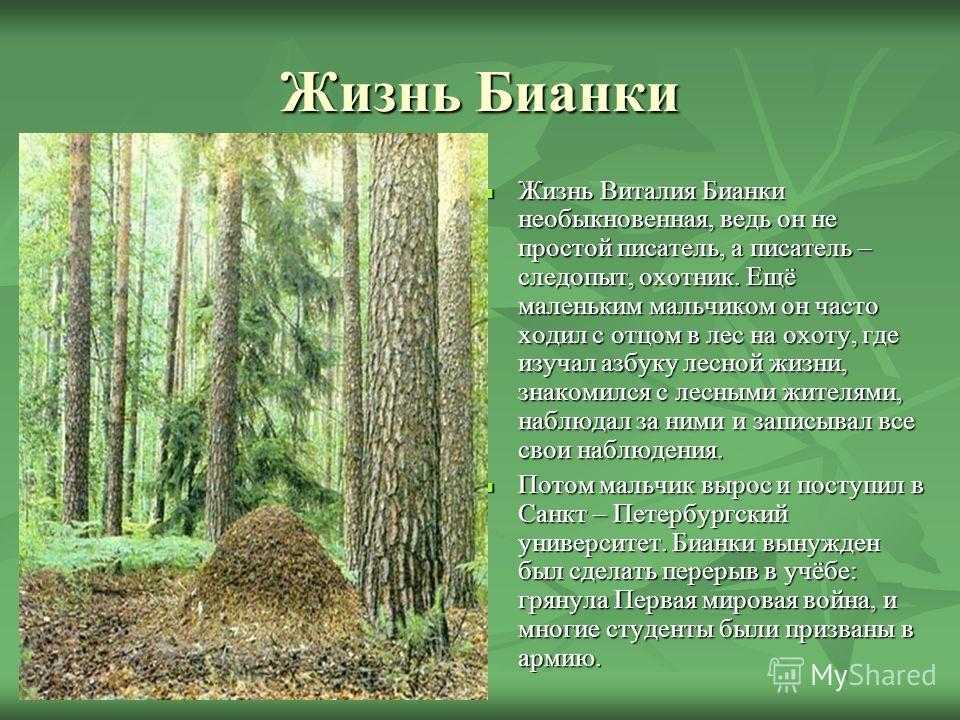 Виталий Валентинович появился на свет в 1894 году города Санкт-Петербург. В детские годы он часто бродил по лесу и с особой охотой слушал рассказы опытных охотников. Он старался вникнуть во многие интересовавшие его тайны природы. Своим главным учителем Бианки считал отца, так как именно он научил его все природные явления записывать в блокнот. Проучившись в гимназии, Виталий Валентинович поступает в Петроградский университет на отделение естественных наук. В 1916 году он выучился на ускоренных курсах военного училища во Владимире и направляется в артиллерийскую бригаду. В 1918 году вступает в партию эсеров и работает в их действующей газете. После мобилизации в Русскую армию, писатель вынужден стать дезертиром и скрываться долгое время под чужой фамилией. Ему пришлось уехать на Алтай, где он с удовольствием стал организатором туристско- краеведческих походов и создателем местного музея. Кроме того Бианки читал лекции по биологии.