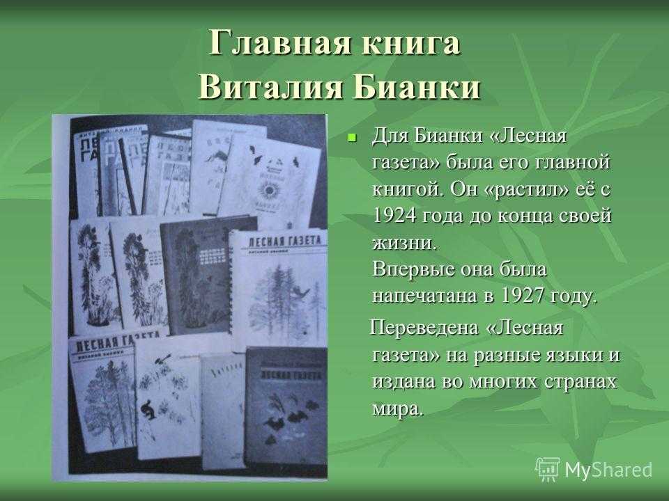 Главная книга Виталия Бианки Для Бианки «Лесная газета» была его главной книгой. Он «растил» её с 1924 года до конца своей жизни. Впервые она была напечатана в 1927 году. Для Бианки «Лесная газета» была его главной книгой. Он «растил» её с 1924 года до конца своей жизни. Впервые она была напечатана в 1927 году. Переведена «Лесная газета» на разные языки и издана во многих странах мира. Переведена «Лесная газета» на разные языки и издана во многих странах мира.