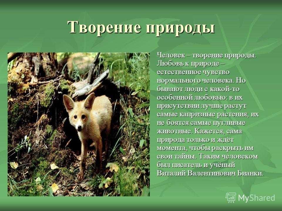 Творение природы Человек – творение природы. Любовь к природе – естественное чувство нормального человека. Но бывают люди с какой-то особенной любовью: в их присутствии лучше растут самые капризные растения, их не боятся самые пугливые животные. Кажется, сама природа только и ждёт момента, чтобы раскрыть им свои тайны. Таким человеком был писатель и учёный Виталий Валентинович Бианки. Человек – творение природы. Любовь к природе – естественное чувство нормального человека. Но бывают люди с какой-то особенной любовью: в их присутствии лучше растут самые капризные растения, их не боятся самые пугливые животные. Кажется, сама природа только и ждёт момента, чтобы раскрыть им свои тайны. Таким человеком был писатель и учёный Виталий Валентинович Бианки.