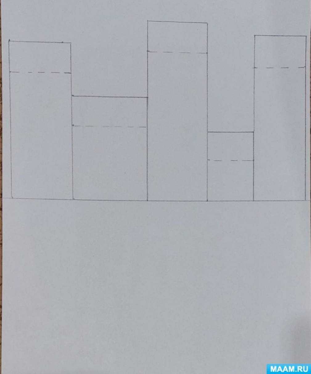 И мы сначала возьмем карандаш и нарисуем домики (как говорят архитекторы, «начертим план», а художники – «набросаем эскиз»). В первую очередь обозначим стену одно-, двух- или многоэтажного дома. Сверху каждого домика, отступив по 2см проведем пунктирную линию.