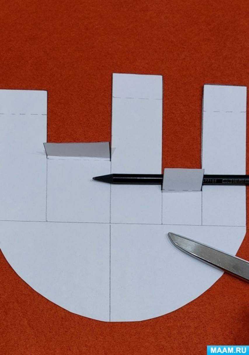 На полукруг наклеиваем зеленую бумагу (травка, а можно сделать дорогу, оформляем небо (наклеиваем солнышко, облака и т. д.).Одну часть зеленого полукруга накладываем на другую и склеиваем. Наша работа становится объемной, подставкой послужила зеленая травка.