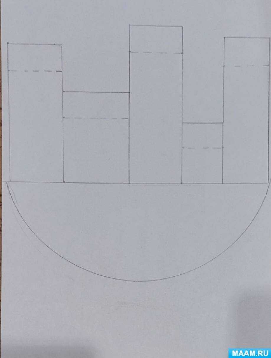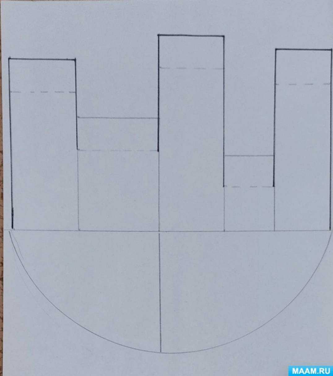 Выделим фломастером контуры домиков до самых нижних пунктирных линий, а через середину полукруга проводим линию.