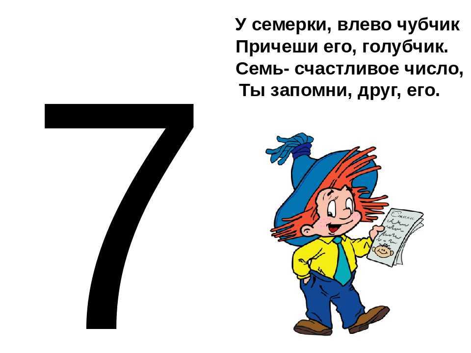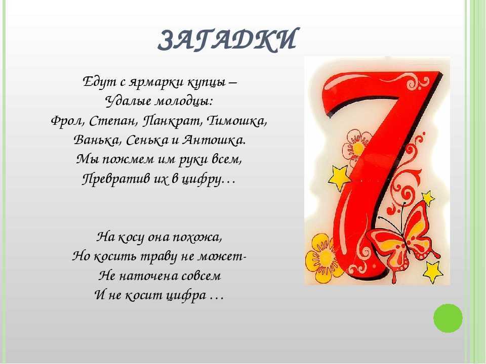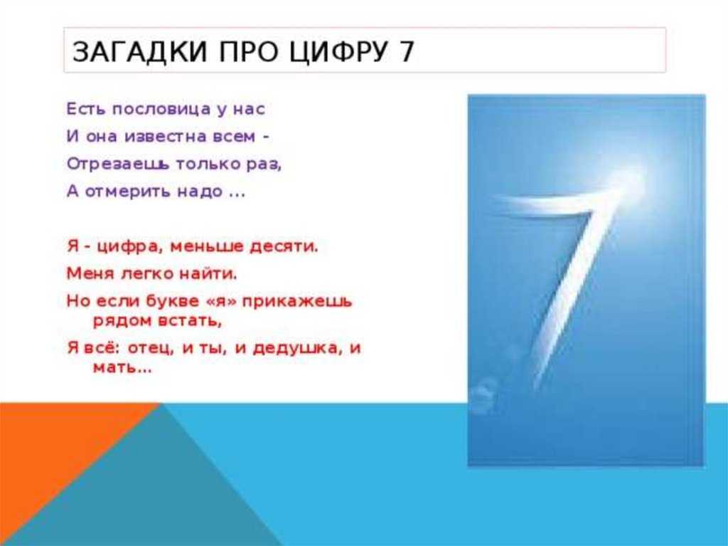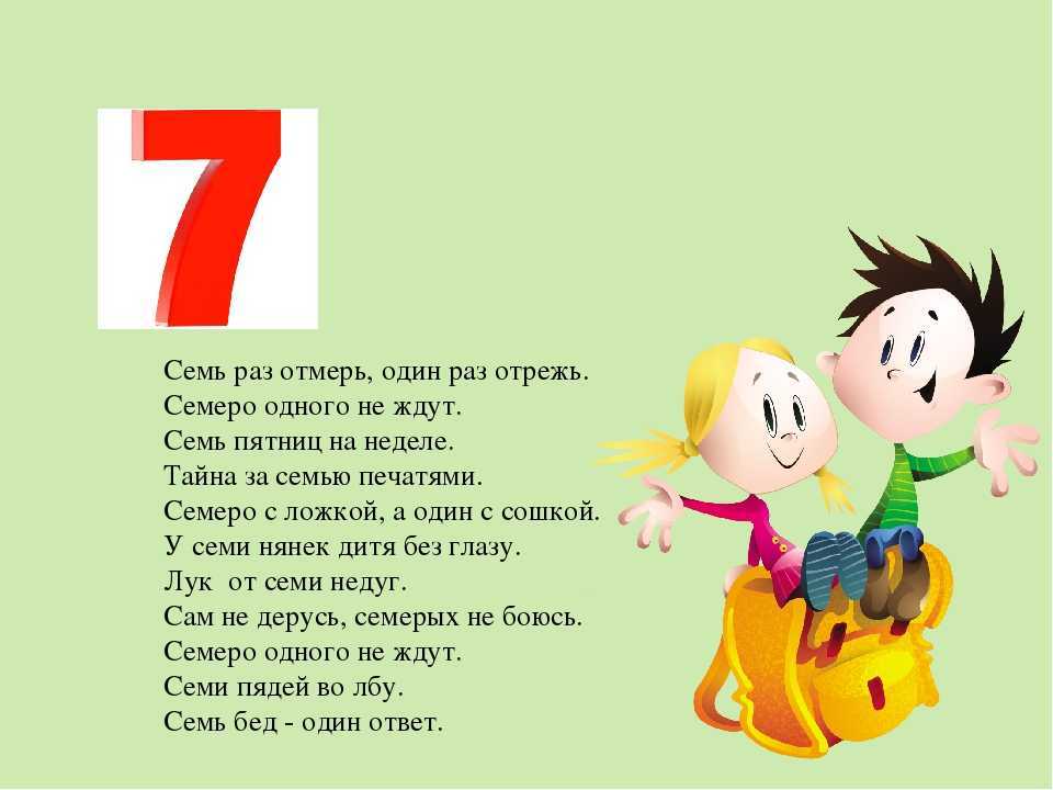 Сколько в радуге цветов, Дней в неделе у китов. Гномиков у Белоснежки, Братьев-близнецов у пешки, Нот, что знают даже дети, И всего чудес на свете, Разобраться с этим всем Нам поможет цифра…