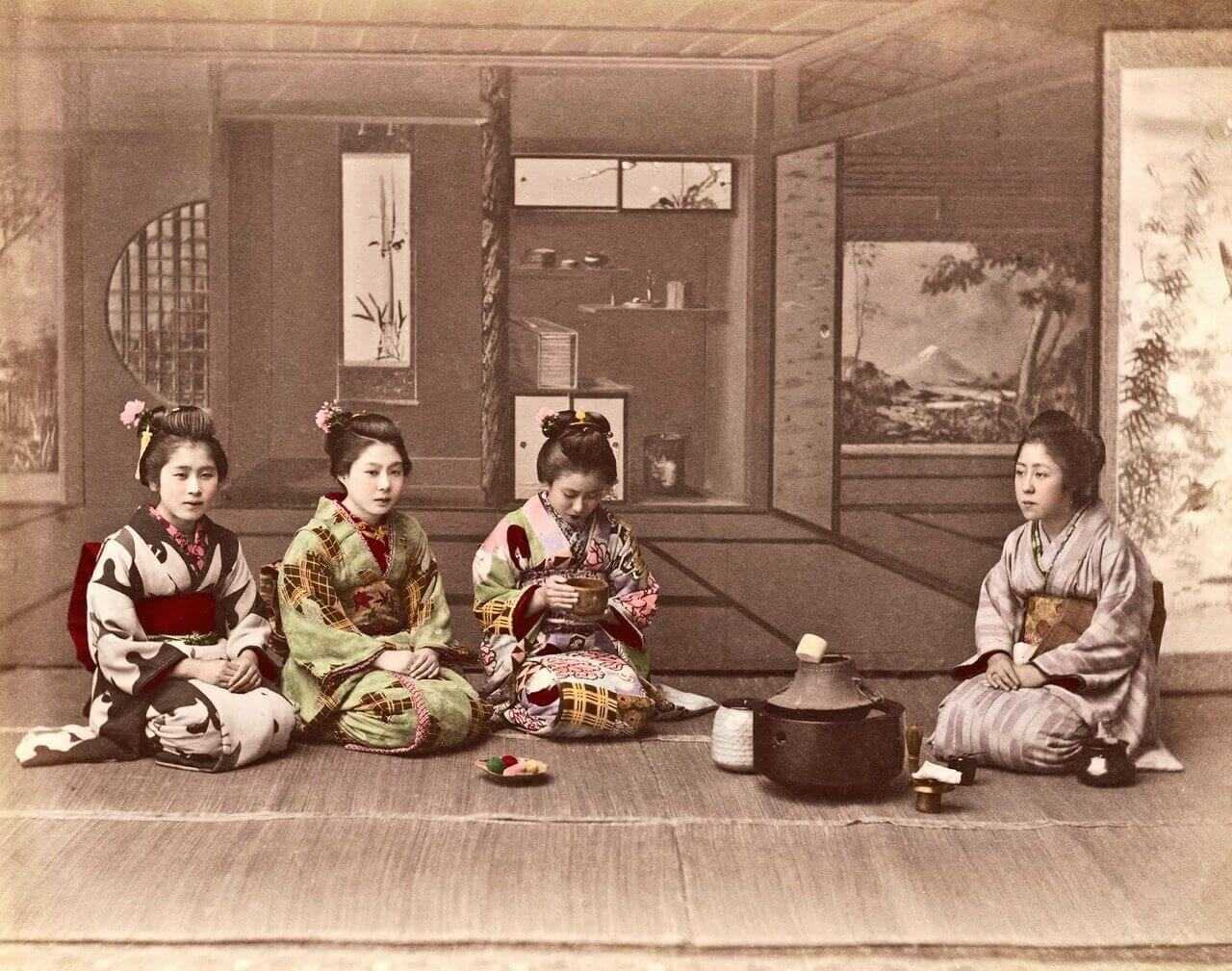 - Чайная церемония. Традиционным японским напитком является чай мятте – светло-зеленый напиток легкой заварки. Однако смысл чаепития состоит не только в употреблении чая. Церемония состоит из нескольких этапов, в ходе которой гостям подаются закуски, демонстрируются картины и скульптуры. Также проводится культурная программа. Исторически специалистами по проведению чайных церемоний стали гейши.
