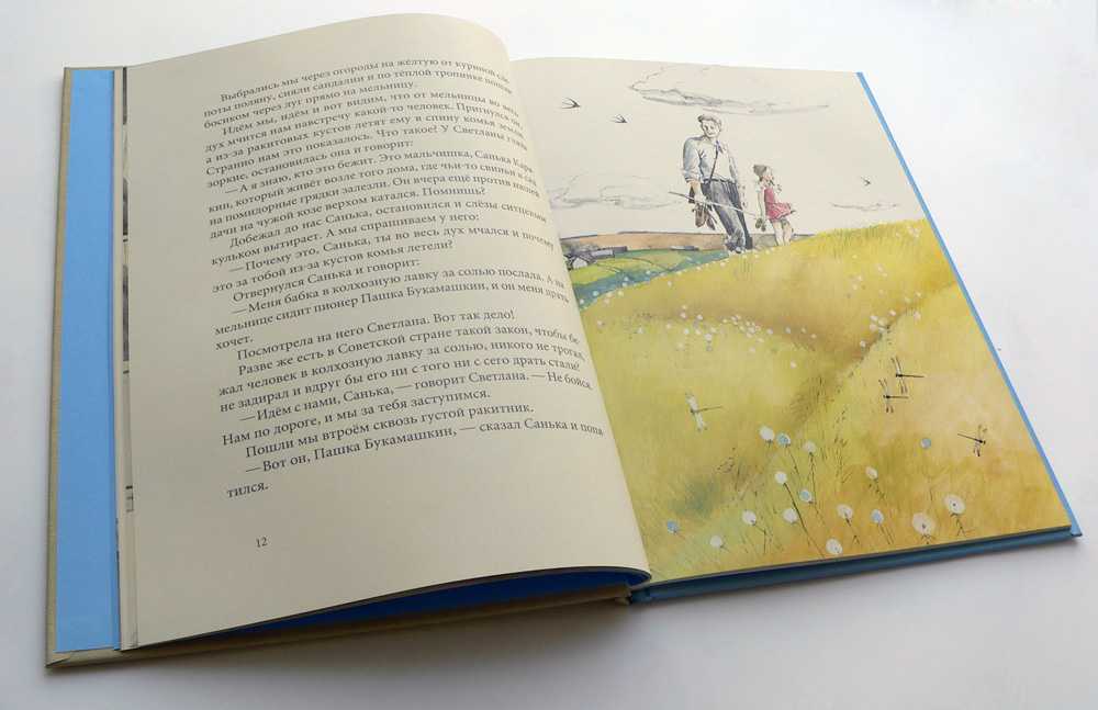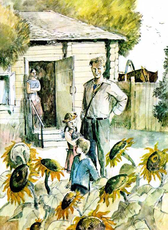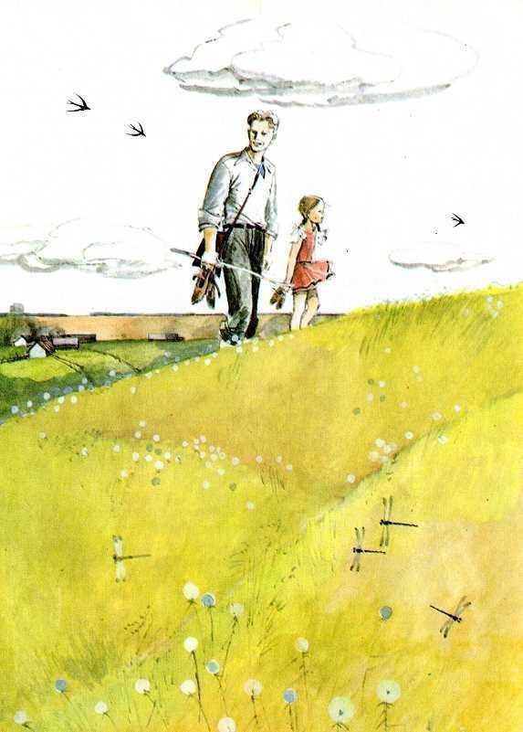 Далеко позади осталась разбитая голубая чашка. Гайдар (краткий пересказ вряд ли сможет передать это в полной мере) рисует мир, насыщенный деталями. Внимательно наблюдают путешественники за жизнью маленькой деревушки, табуном лошадей, кладбищем, деревом, чижом. Знакомятся герои и с семьей колхозного сторожа – его дочерью Валентиной и внуком, забавным четырехлетним Федором. Отец с дочерью едва не утонули в болоте, накупались в реке и получили в подарок крохотного котенка. Одним словом, день получился крайне насыщенным.