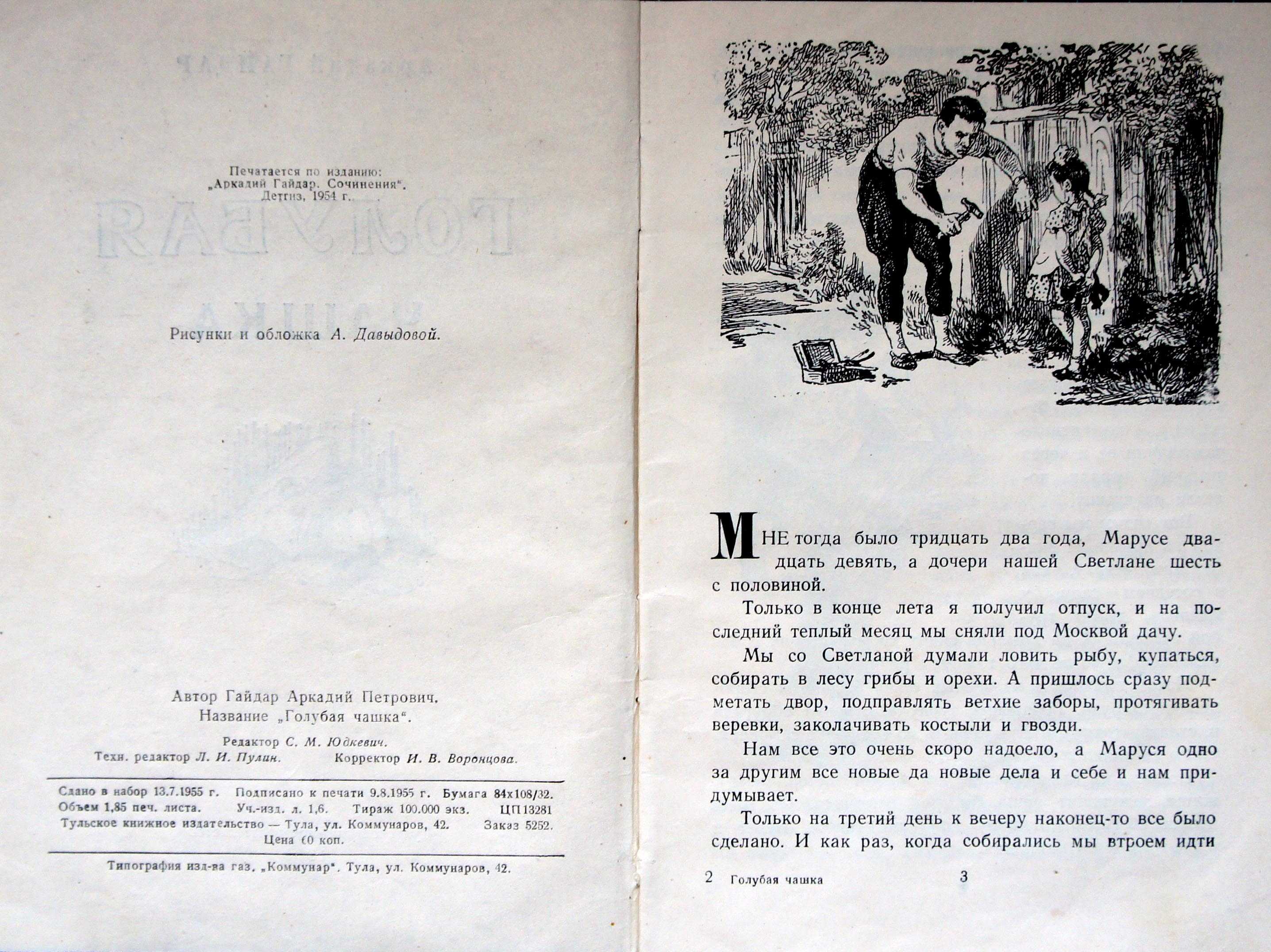 “Мне тогда было тридцать два года…” – так начинается “Голубая чашка”. Летом 1935 года, когда в селе под Арзамасом Аркадий Гайдар написал эти слова, и осенью в Малеевке, под Москвой, когда писатель заканчивал рассказ, ему действительно шел тридцать второй год. На фронтовых дорогах гражданской войны встречалась ему Маруся – Мария Плаксина. В первом варианте “Голубой чашки” была не дочь Светлана, а сын – Димка…