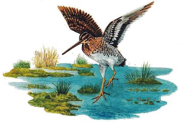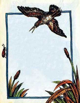 «Эх, — думает долгоносый Бекас под кочкой, — надо и мне спеть! Только вот чем? Горло у меня не годится, нос не годится, шея не годится, крылышки не годятся, лапки не годятся… Эх! Была не была, — полечу, не смолчу, чем-ни- будь да закричу!»