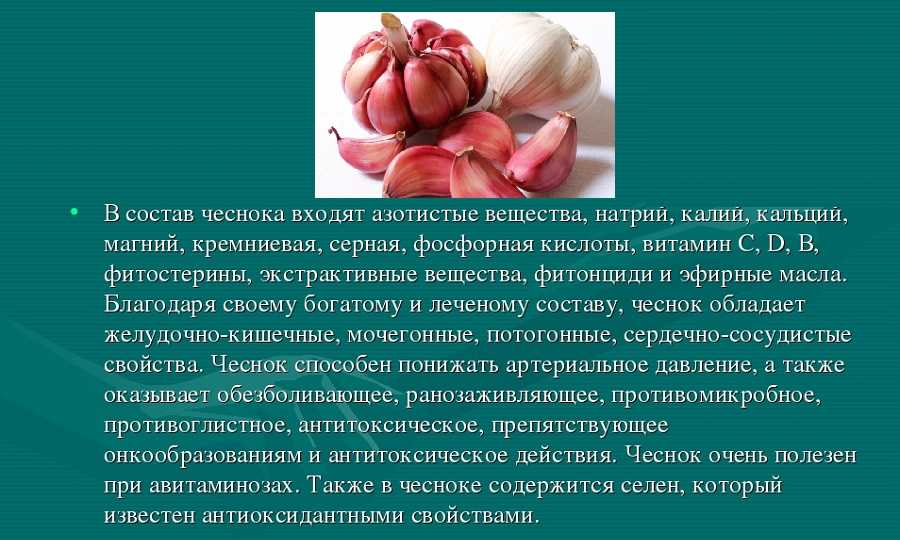 Эти вещества активно участвуют в клеточных процессах. Так, они поддерживают нормальную работу практически всех органов в организме. В некоторых из компонентов детский организм нуждается особо. В чесночной мякоти содержатся также уникальные специфические вещества – фитонциды. Особенность действия этих компонентов заключается в том, что они помогают организму бороться с различными патогенными микробами. Фитонциды помогают защитить организм от различных инфекций, передающихся воздушно-капельным путем.