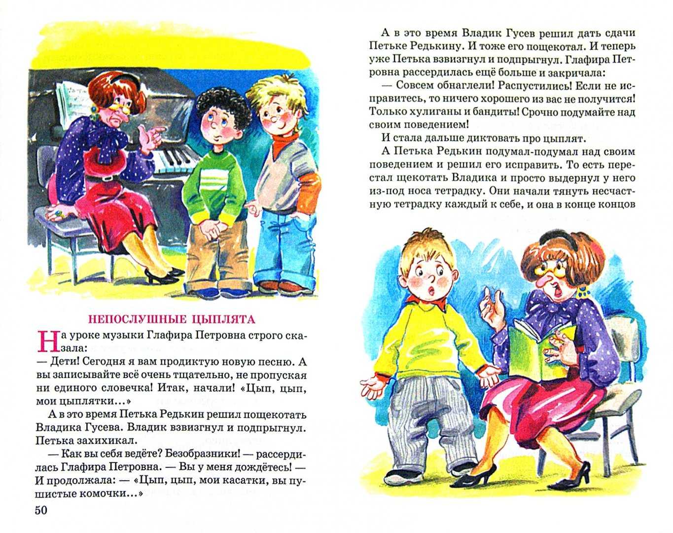 А в это время Владик Гусев решил дать сдачу Петьке Редькину. И тоже его пощекотал. И теперь уже Петька взвизгнул и подпрыгнул. Глафира Петровна рассердилась ещё больше и крикнула: