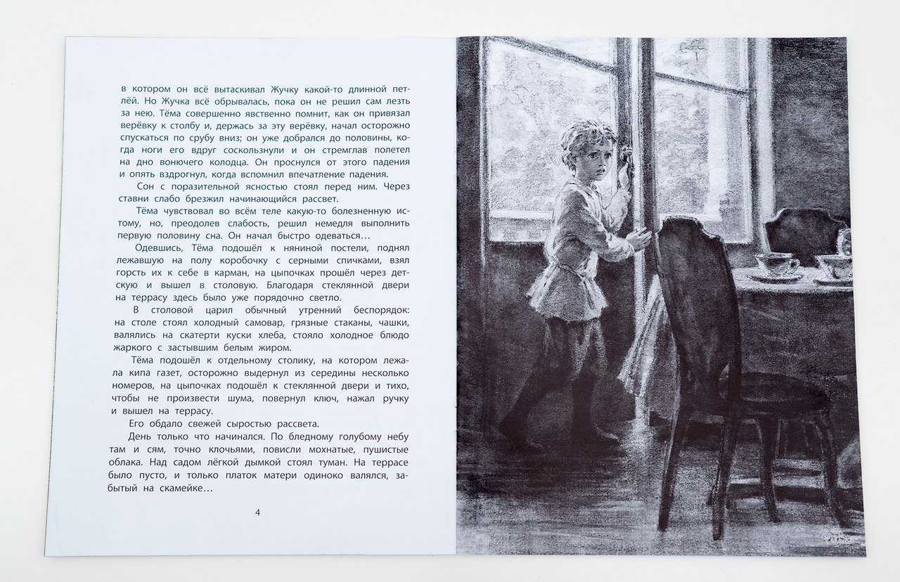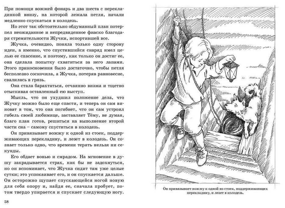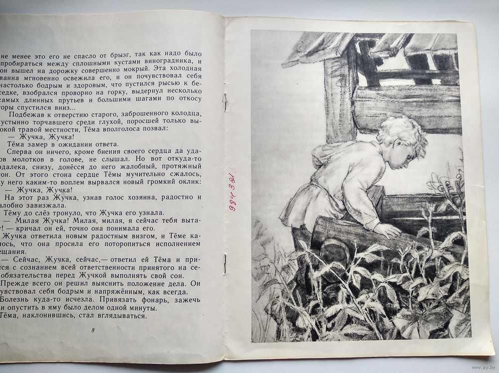 Тёма с ужасом вслушивается в слова няни. Мысли роем теснятся в его голове, у него мелькает масса планов, как спасти Жучку, он переходит от одного невероятного проекта к другому и незаметно для себя снова засыпает. Он просыпается опять от какого-то толчка среди прерванного сна, в котором он все вытаскивал Жучку какой-то длинной петлей.