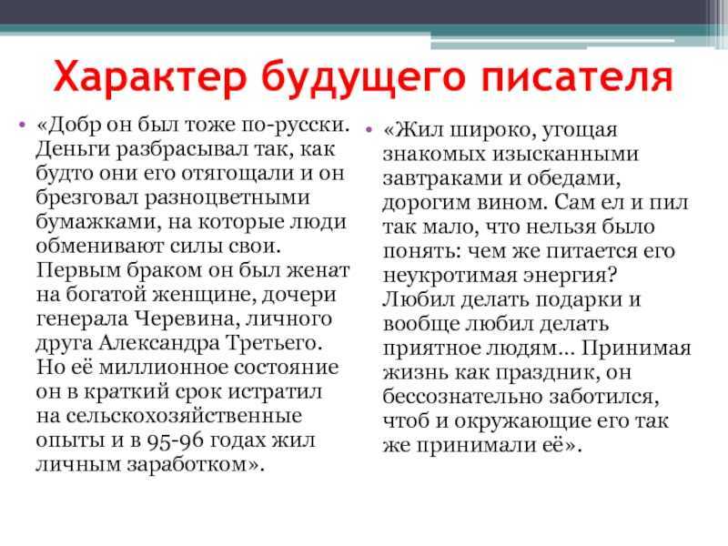 Слайд 8Характер будущего писателя«Добр он был тоже по-русски. Деньги разбрасывал