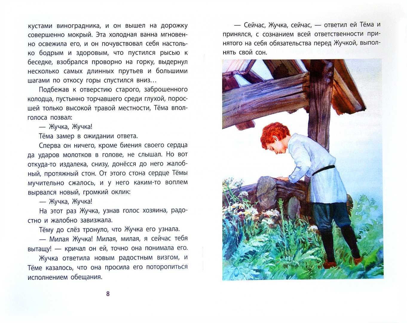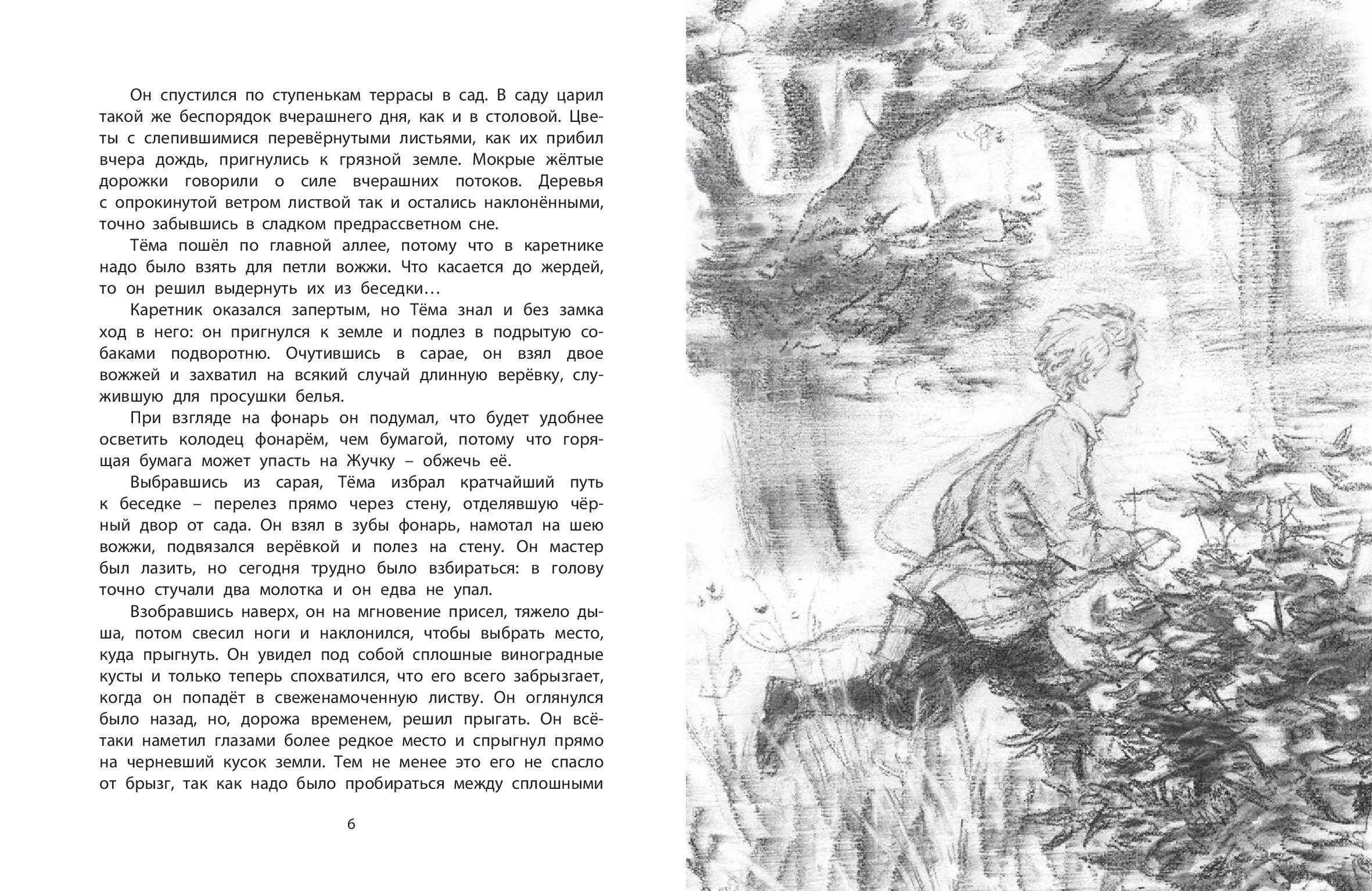 Тихо пройдя через весь дом, мальчик вышел в сад. Нельзя было медлить, ведь Жучка сидела в колодце. Мальчик взял вожжи и фонарь и отправился к стене кладбища, где находился колодец. Тёме казалось, что за ним наблюдают мертвецы. Было очень страшно, да к тому же всё тело одолела слабость: мальчик уже был болен, но ещё не замечал этого.