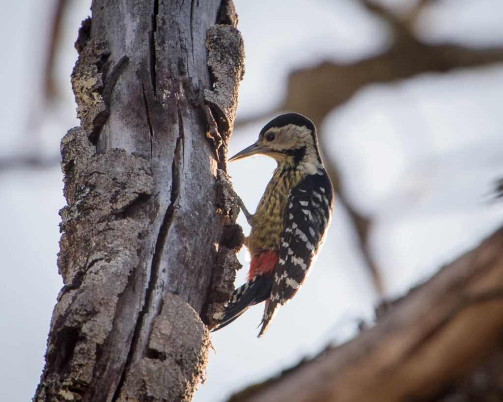 Размеры этой птицы относительно небольшие: 22 см, зато вес может доходить до 80 г. У дятлов короткий темно-серый клюв. Верхняя часть тела черно-белая, на крыльях располагаются пестрины. Живот и бока имеют желтый оттенок, присутствуют продольные черные линии. «Усы» практически не выражены. В области темени находится ярко-красная «шапочка». У молодых особей оперение более тусклое, чем у взрослых. Представители этой разновидности встречаются на юге Европы и в Передней Азии. Для жизни они выбирают смешенные леса, в которых доминирует присутствие дуба.
