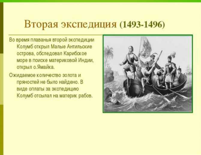 Получив чин адмирала, в сентябре 1493 года, Колумб на семнадцати кораблях отправляется во вторую экспедицию. В ее состав, по разным источникам, вошло от 1 500 до 2 500 человек, в том числе дворяне, придворные, монахи, священники, чиновники. Их привлекала быстрая нажива на новых землях. Суда были наполнены животными, семенами растений, различной бытовой утварью для организации проживания на открытых территориях. Добравшись до Эспаньолы (Гаити), мореплаватели увидели, что на месте поселения, организованного в первой экспедиции остались одни развалины, все европейцы убиты местными аборигенами. Сегодня на этом месте город Санто-Доминго.