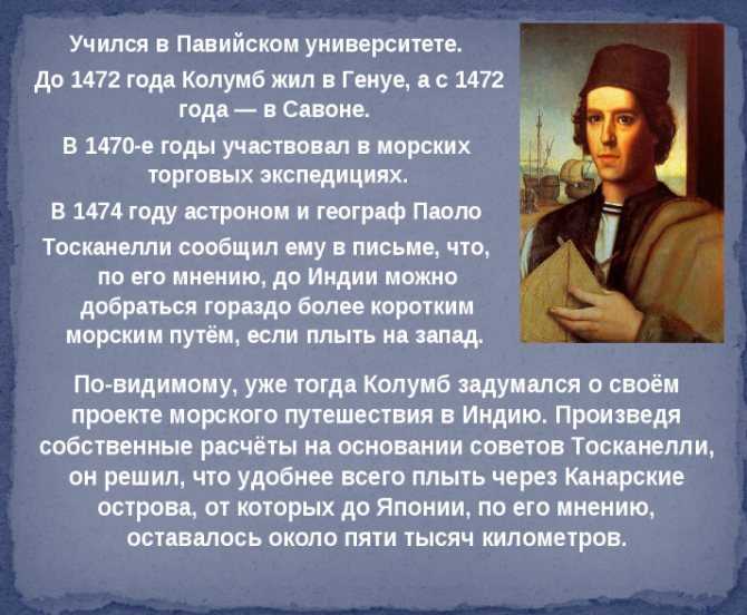 Предположительно, родился Христофор Колумб в итальянском городе Генуя в 1451 г. Но, так как доподлинно это не известно, несколько городов в Испании и Италии оспаривают право называться родиной Колумба. Выходец из простой семьи (отец его был ткачом, а мать домохозяйкой), он получил хорошее образование. До четырнадцати лет Христофор обучался дома, при этом делал большие успехи в математике и иностранных языках, в числе которых была латынь. Благодаря протекции обеспеченных земляков, Колумбу удалось поступить в университет в Падуе. Семья его была бедной и Колумб был вынужден браться за любую работу. Все, чем он занимался, было связано с морем: торговый представитель, капитан, картограф, пилот-навигатор. Почти всю свою жизнь Христофор Колумб провел в плавании. В 80-х годах 15 века, чтобы попасть в Индию, португальцы пробовали обогнуть африканский континент. Колумб предполагал, что можно попасть в Азию, держа путь на запад.