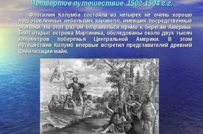 В 1502 году была организована четвертая и последняя экспедиция мореплавателя Христофора Колумба. За это время им были открыты две тысячи км берегов Центр. Америки. Так как проход к западу им не был найден, Колумб решил повернуть на север и потерпел крушение рядом с Ямайкой. В ноябре 1504 года он вернулся в Кастилию.