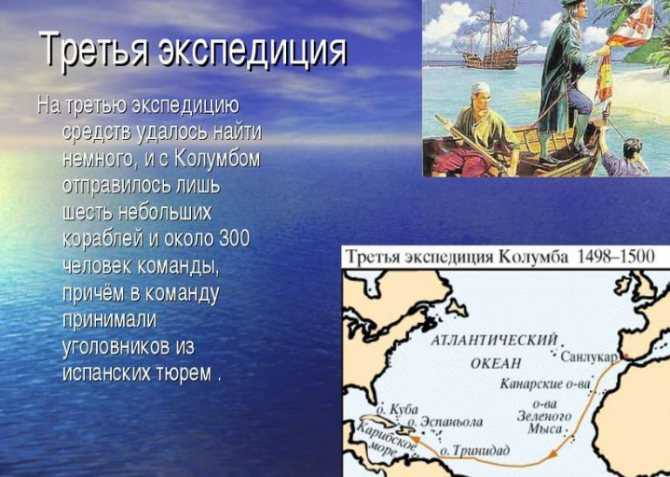 Третья экспедиция (1498-1500). Колумб отправился в путь, который пролегал на уровне экватора, во главе 6 кораблей. 31 июля он бросил якорь у Южно-Американского континента, думая, что он прибыл в Индию. Колумб писал о новых открываемых им местах, как о рае. В его голове зарождались сомнения по поводу того, что он открыл. Именно изобилие пресной воды натолкнуло его на идею открытия земного рая. Это помрачило сознание Колумба.