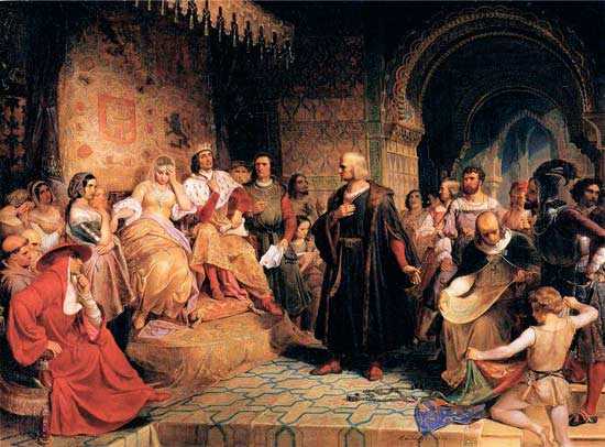 Колумб перед королями Фердинандом и Изабеллой. Картина Э. Лойце, 1843