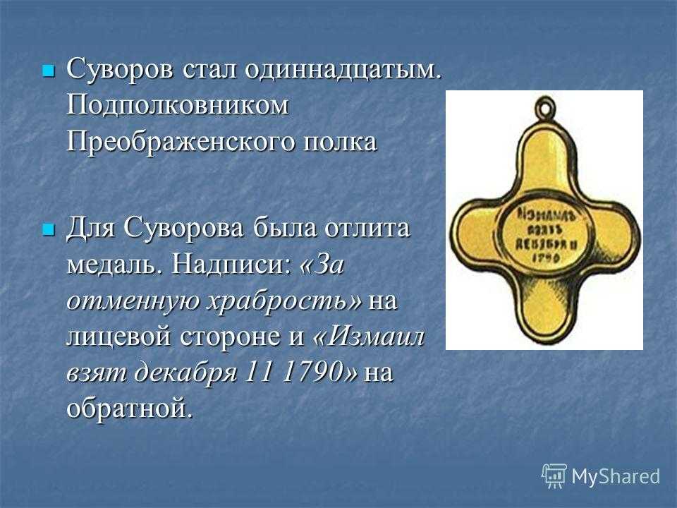 Суворов стал одиннадцатым. Подполковником Преображенского полка Суворов стал одиннадцатым. Подполковником Преображенского полка Для Суворова была отлита медаль. Надписи : « За отменную храбрость » на лицевой стороне и « Измаил взят декабря » на обратной. Для Суворова была отлита медаль. Надписи : « За отменную храбрость » на лицевой стороне и « Измаил взят декабря » на обратной.