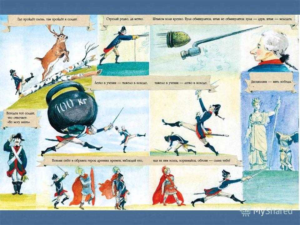 Воспитатель: И напрасно. Вот Суворову эта его привычка очень помогла во время военной службы. Он даже поздней осенью ходил в легкой форме и не переодевался в зимнее обмундирование, пока всем его солдатам не выдавали теплую форму.