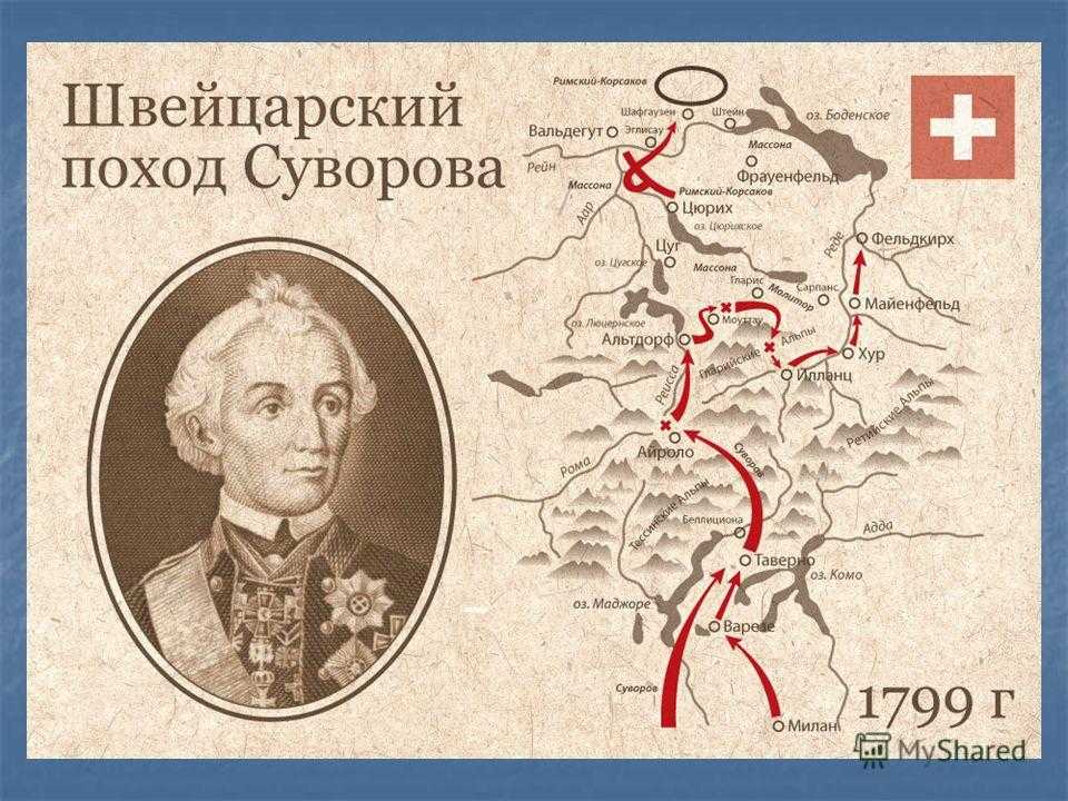 В 1799 г., при Павле I, состоялся итальянский поход русского командира. Он участвует в крупнейших сражениях между русско-австрийскими войсками. Результат походов – освобождение Северной Италии от французского господства. Великой страницей в русской истории стал Швейцарский поход Суворова. Это было труднейшее испытание. Переход Суворова через Альпы увековечил своей работой художник Суриков. За победу в героическом походе полководцу присвоили звание Генералиссимуса. Князь Италийский, граф Рымникский, генерал-фельдмаршал стал обладателем всех военных орденов того времени.