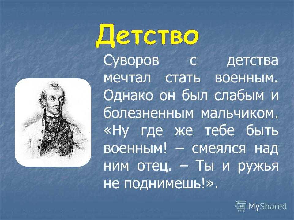 Суворов с детства мечтал стать военным. Однако он был слабым и болезненным мальчиком. «Ну где же тебе быть военным! – смеялся над ним отец. – Ты и ружья не поднимешь!».
