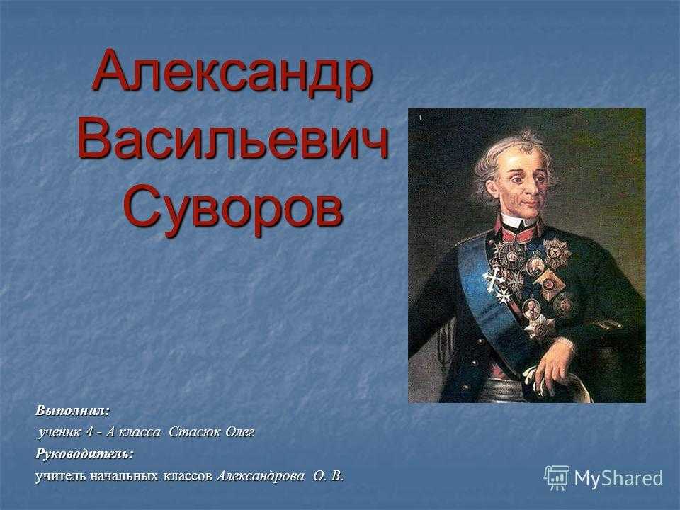 Презентация 4 класса на тему: «Александр Васильевич Суворов Выполнил: ученик 4 — А класса Стасюк Олег ученик 4 — А класса Стасюк ОлегРуководитель: учитель начальных классов Александрова.». Скачать бесплатно и без регистрации. — Транскрипт: