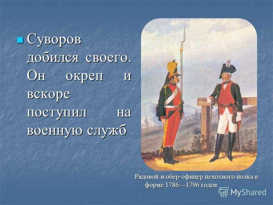 Суворов добился своего. Он окреп и вскоре поступил на военную служб Суворов добился своего. Он окреп и вскоре поступил на военную служб Рядовой и обер-офицер пехотного полка в форме годов