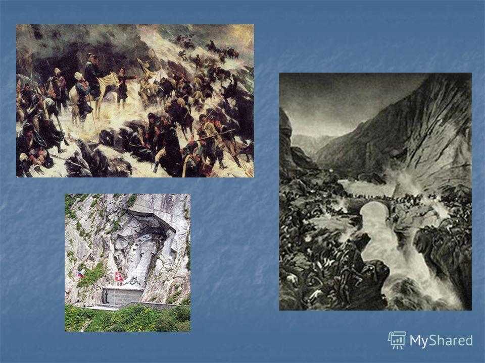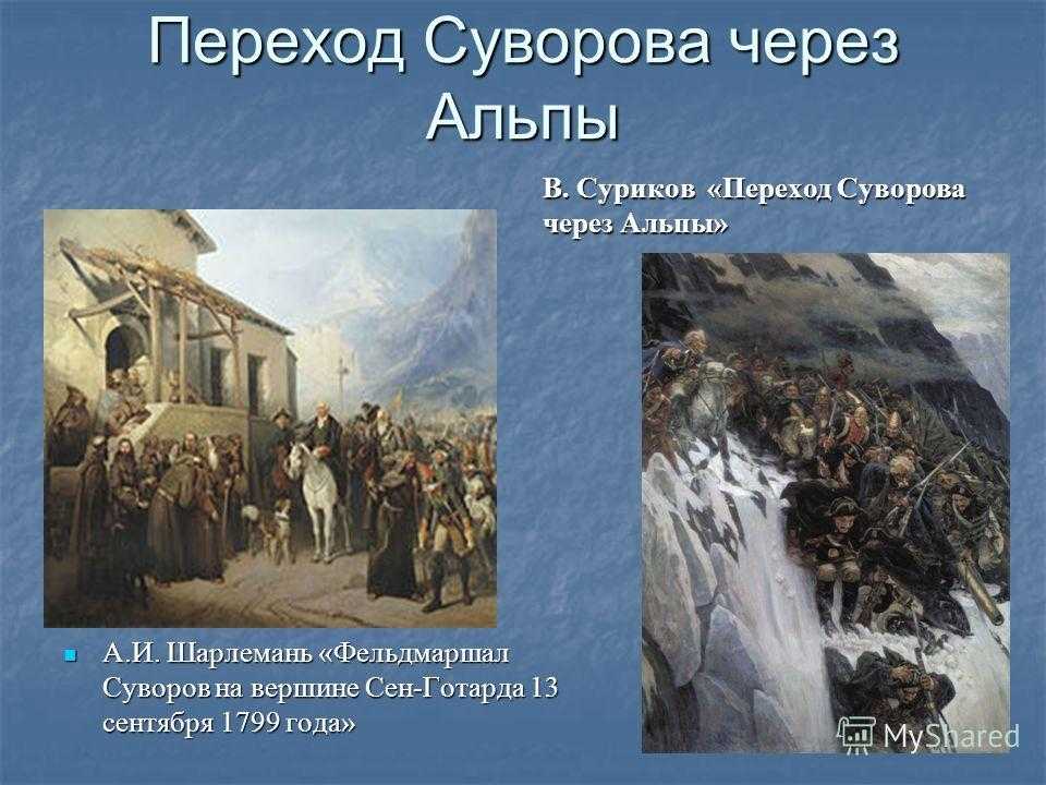 Переход Суворова через Альпы А.И. Шарлемань «Фельдмаршал Суворов на вершине Сен-Готарда 13 сентября 1799 года» А.И. Шарлемань «Фельдмаршал Суворов на вершине Сен-Готарда 13 сентября 1799 года» В. Суриков «Переход Суворова через Альпы»